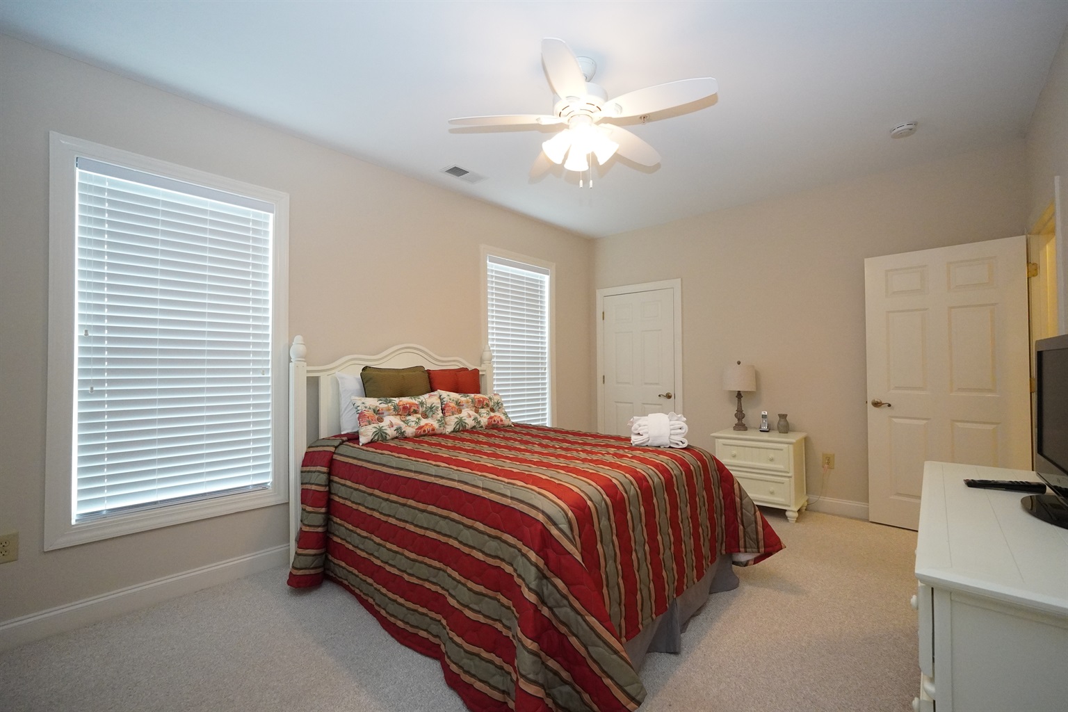 💤 Third Bedroom: Queen bed with TV and closet storage. Convenient access to a full hall bath with tub/shower.