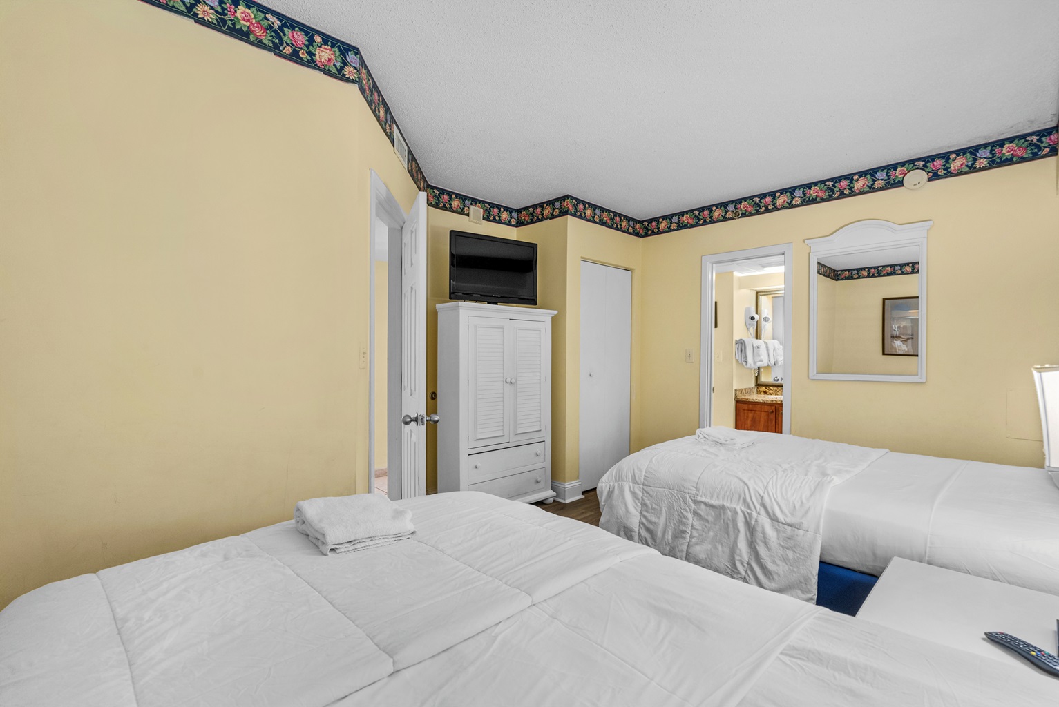 💤 Second Bedroom: Two full beds, TV, and plenty of storage — great for families or friends.